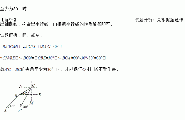 解放战争时期,某天江南某游击队从村庄A处出发向正东方向行进,此时有一支残匪在游击队的东北方向B处,残匪沿北偏东60°方向向C村进发,游击队步行到A′(A′在B的正南方向)处时,突然接到上级命令,决定改变行进方向,沿北偏东30°方向赶往C村,问:游击队的进发方向A′C与残匪的行进方向BC至少成多大角度时,才能保证C村村民不受伤害?