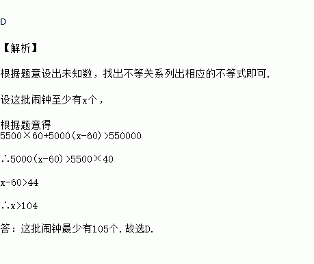 个的价格将剩下的闹钟全部售出,销售总额超过了5500元,这批闹钟至少有![]()