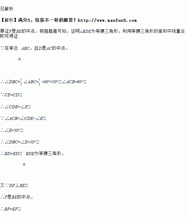 如图,等边△ABC中,D是AC的中点,E是BC延长线上的一点,且CE=CD,DF⊥BE,垂足是F,求证:BF=EF.