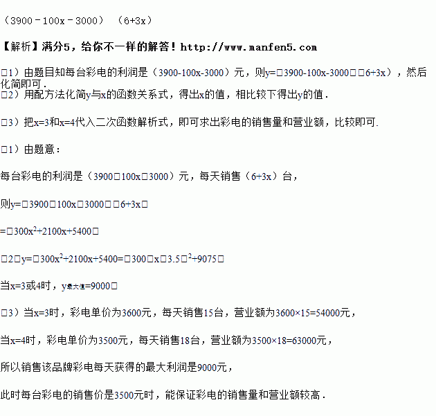 某商场将每台进价为3000元的彩电以3900元的销售价售出,每天可销售出6台,这种彩电每台降价100x(x为整数)元,每天可以多销售出3x台.