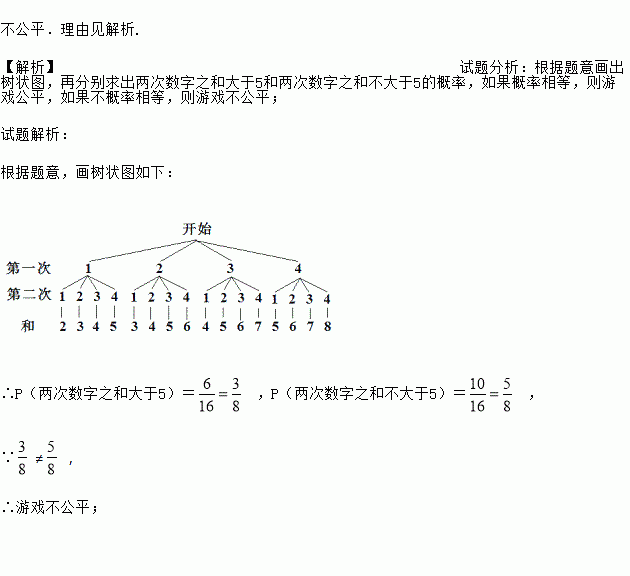 不公平.理由见解析. 【解析】试题分析:根据题意画出树状图,再分别求出两次数字之和大于5和两次数字之和不大于5的概率,如果概率相等,则游戏公平,如果不概率相等,则游戏不公平; 试题解析: 根据题意,画树状图如下: ∴P(两次数字之和大于5)= ,P(两次数字之和不大于5)= , ∵≠, ∴游戏不公平;