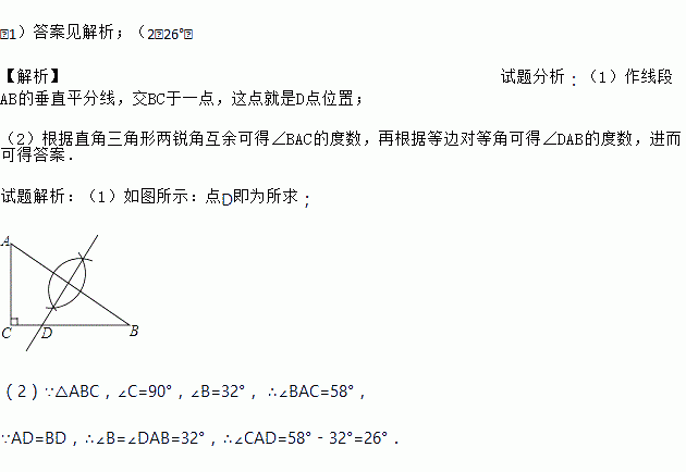 (2)连结AD,若∠B=32°,求∠CAD的度数.