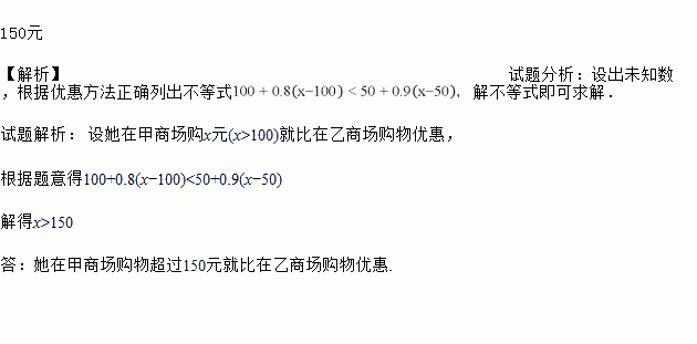 甲商场一次性购物超过100元,超过的部分8折优惠;乙商场一次性购物超过50元,超过部分9折优惠,那么她在甲商场购物超过多少元就比在乙商场购物优惠