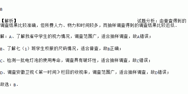 B ¡¾½âÎö¡¿ÊÔÌâ·ÖÎö£ºÓÉÆÕ²éµÃµ½µÄµ÷²é½á¹û±È½Ï׼ȷ£¬µ«Ëù·ÑÈËÁ¦¡¢ÎïÁ¦ºÍʱ¼ä½Ï¶à£¬¶ø³éÑùµ÷²éµÃµ½µÄµ÷²é½á¹û±È½Ï½üËÆ£® ¡¾½âÎö¡¿ A¡¢Á˽âÎÒÊ¡ÖÐѧÉúµÄÊÓÁ¦Çé¿ö£¬µ÷²é·¶Î§¹ã£¬ÊʺϳéÑùµ÷²é£¬¹ÊA´íÎó£» B¡¢Á˽âÆß£¨1£©°àѧÉúУ·þµÄ³ßÂëÇé¿ö£¬ÊÊºÏÆÕ²é£¬¹ÊBÕýÈ·£» C¡¢¼ì²âÒ»ÅúµçµÆÅݵÄʹÓÃÊÙÃü£¬µ÷²é¾ßÓÐÆÆ»µÐÔ£¬ÊʺϳéÑùµ÷²é£¬¹ÊC´íÎó£» D¡¢µ÷²é°²»ÕÎÀÊÓ¡¶µÚһʱ¼ä¡·À¸Ä¿µÄÊÕÊÓÂÊ£¬...