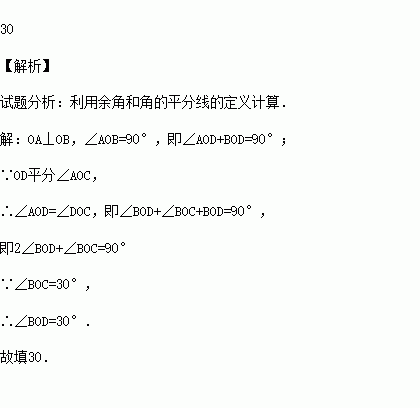 (2013秋•故城县期末)如图,OA⊥OB,∠BOC=30°,OD平分∠AOC,则∠BOD= 度.