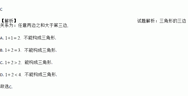 C 【解析】试题解析:三角形的三边关系为:任意两边之和大于第三边. A. 不能构成三角形. B. 不能构成三角形. C. 能构成三角形. D. 不能构成三角形. 故选C.