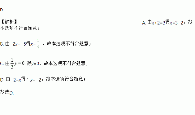 A. 由x+2=3得x=3+2 B. 由-2x=-5得![]()