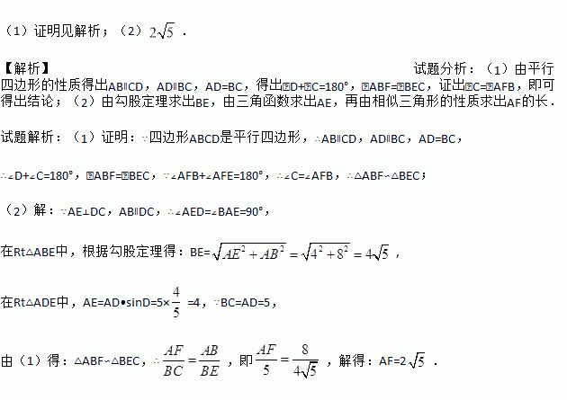 (2)若AD=5,AB=8,sinD=,求AF的长.