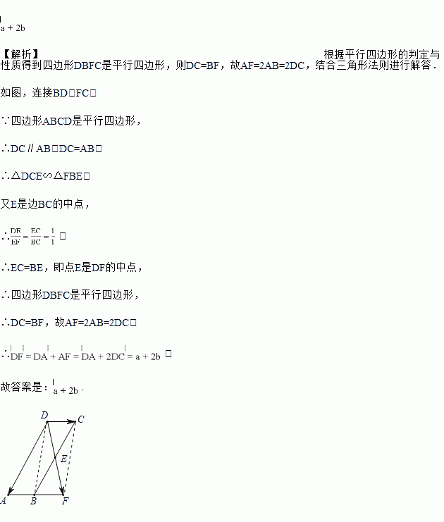 如图,已知平行四边形ABCD,E是边BC的中点,联结DE并延长,与AB的延长线交于点F.设=,=那么向量用向量、表示为_____.