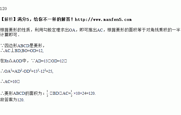 如图,在菱形ABCD中,AD=13,BD=24,AC,BD交于点O,则菱形ABCD的面积为_________.