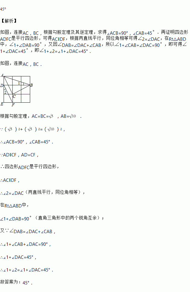 如图,在3×3的正方形网格中标出了∠1和∠2,则∠1+∠2=_____.