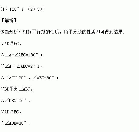 如图,AD∥BC,∠A是∠ABC的2倍,(1)∠A=____度;(2)若BD平分∠ABC,则∠ADB=____。