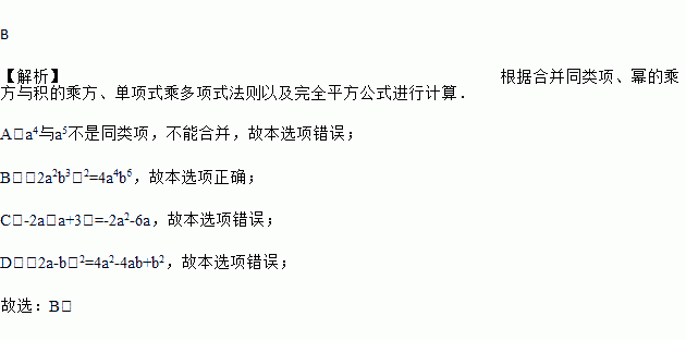 A. a4+a5=a9 B. (2a2b3)2=4a4b6