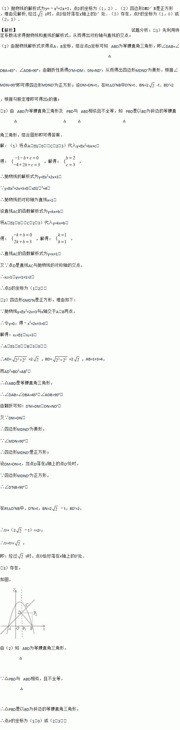 (3)在平面内,是否存在点P(异于A点),使得以P、B、D为顶点的三角形与△ABD相似(全等除外)?若存在,请直接写出点P的坐标,若不存在,请说明理由.
