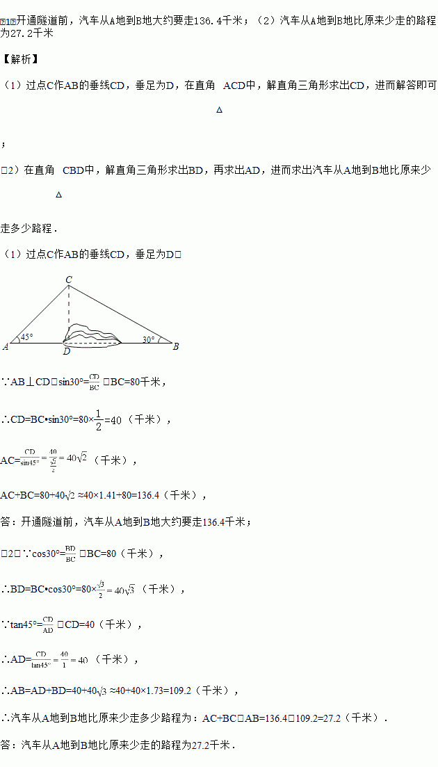 为加快城乡对接,建设全域美丽乡村,某地区对A、B两地间的公路进行改建.如图,A、B两地之间有一座山,汽车原来从A地到B地需途径C地沿折线ACB行驶,现开通隧道后,汽车可直接沿直线AB行驶.已知BC=80千米,∠A=45°,∠B=30°.
