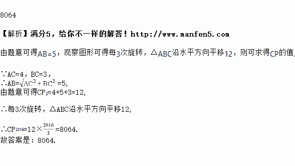 如图,AC=4,BC=3,且BC边在直线l上,将△ABC绕点C顺时针旋转到位置①可得到P1,再将位置①的三角形绕点P1顺时针旋转到位置②可得到P2,将位置②的三角形绕点P2顺时针旋转到位置③得到P3,按此规律继续旋转,则CP2016=_____.