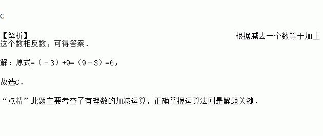 C 【解析】根据减去一个数等于加上这个数相反数,可得答案. 【解析】 原式=(﹣3)+9=(9﹣3)=6, 故选C. “点精”此题主要考查了有理数的加减运算,正确掌握运算法则是解题关键.