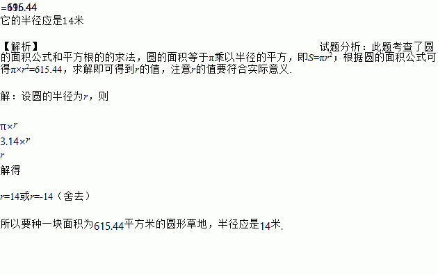 要种一块面积为615.44的圆形草地以美化家庭,它的半径应是多少米?(π取3.14)