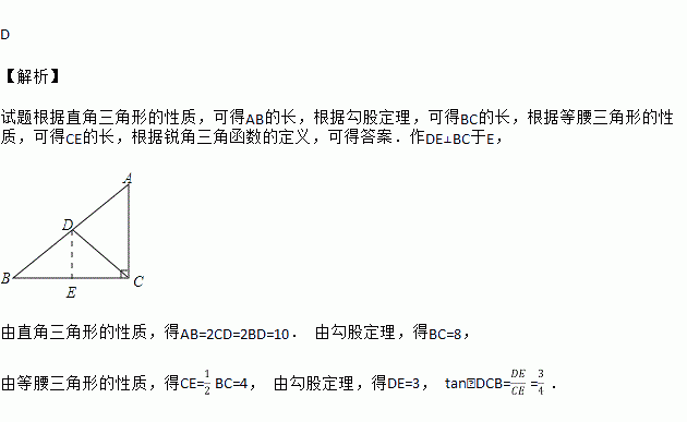 如图,在Rt△ABC中,CD是斜边AB上的中线,已知CD=5,AC=6,则tan∠DCB的值是( )
