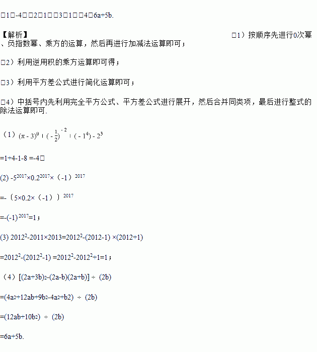 (3) 20122-2011×2013 (4)[(2a+3b)2-(2a-b)(2a+b)](2b)