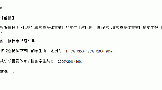 B 【解析】 根据扇形图可以得出该校喜爱体育节目的学生所占比例,进而得出该校喜爱体育节目的学生数目. 【解析】 根据扇形图可得: 该校喜爱体育节目的学生所占比例为:1﹣5%﹣35%﹣30%﹣10%=20%, 故该校喜爱体育节目的学生共有:2000×20%=400, 故选:B.