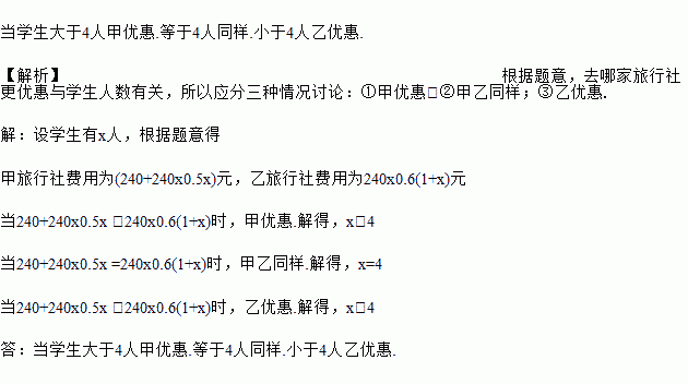 某校校长暑假将带领该校“市级三好学生”去三峡旅游.甲旅行社说:如果校长买全票一张,则其余学生可以享受半价优惠;乙旅行社说:包括校长在内全部按全票的6折优惠.已知两家旅行社的全票价都是240元,请你就学生数说明哪家旅行社更优惠