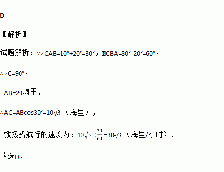 一渔船在海岛A南偏东20°方向的B处遇险,测得海岛A与B的距离为20海里,渔船将险情报告给位于A处的救援船后,沿北偏西80°方向向海岛C靠近,同时,从A处出发的救援船沿南偏西10°方向匀速航行,20分钟后,救援船在海岛C处恰好追上渔船,那么救援船航行的速度为( )