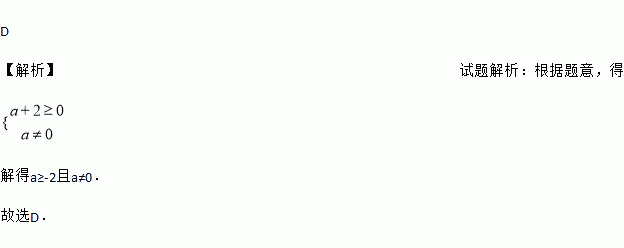 D 【解析】试题解析:根据题意,得 解得a≥-2且a≠0. 故选D.