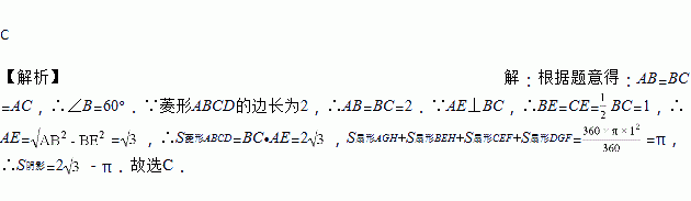 如图,菱形ABCD的边长为2,且AE⊥BC,E、F、G、H分别为BC、CD、DA、AB的中点,以A、B、C、D四点为圆心,半径为1作圆,则图中阴影部分的面积是( )