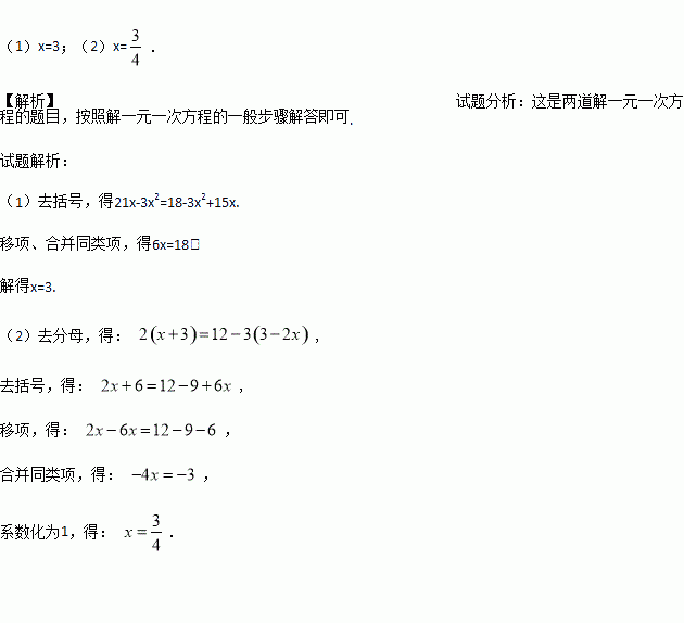 解下列方程:(1)3x(7-x)=18-x(3x-15); (2)