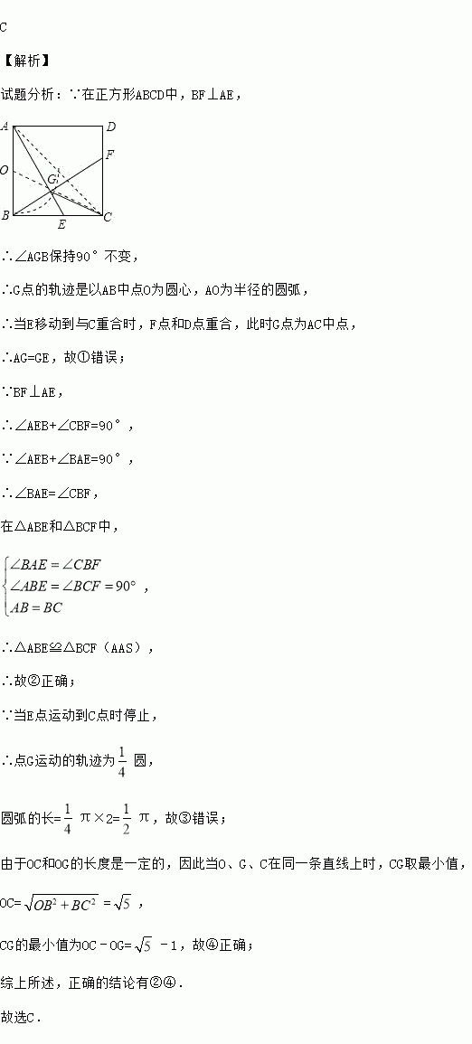 C 【解析】 试题分析:∵在正方形ABCD中,BF⊥AE, ∴∠AGB保持90°不变, ∴G点的轨迹是以AB中点O为圆心,AO为半径的圆弧, ∴当E移动到与C重合时,F点和D点重合,此时G点为AC中点, ∴AG=GE,故①错误; ∵BF⊥AE, ∴∠AEB+∠CBF=90°, ∵∠AEB+∠BAE=90°, ∴∠BAE=∠CBF, ...