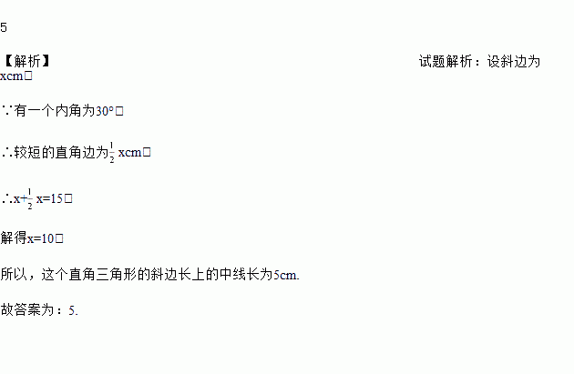 在Rt△中有一个内角为30°,且斜边和较短直角边之和为15cm,则这个直角三角形的斜边长上的中线长为________cm.