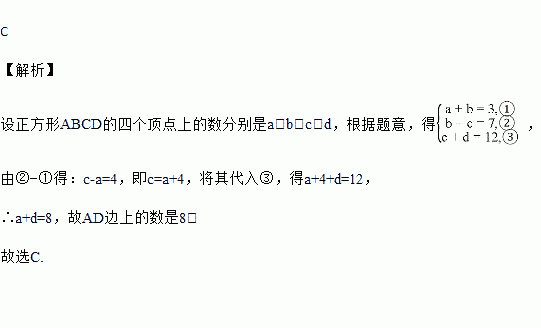 如图,在正方形ABCD的每个顶点上写一个数,把这个正方形每条边的两端点上的数加起来,将和写在这条边上,已知AB上的数是3,BC上的数是7,CD上的数是12,则AD上的数是( )