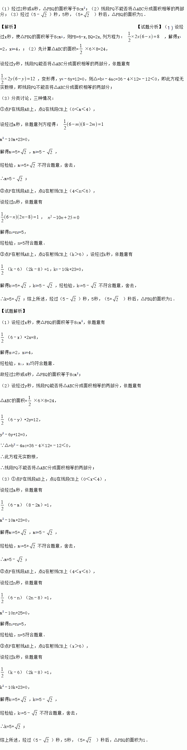(1)点P从点A开始沿AB边向B以1cm/s的速度移动,点Q从B点开始沿BC边向点C以2cm/s的速度移动.如果P,Q分别从A,B同时出发,经过几秒,使△PBQ的面积等于8cm2?