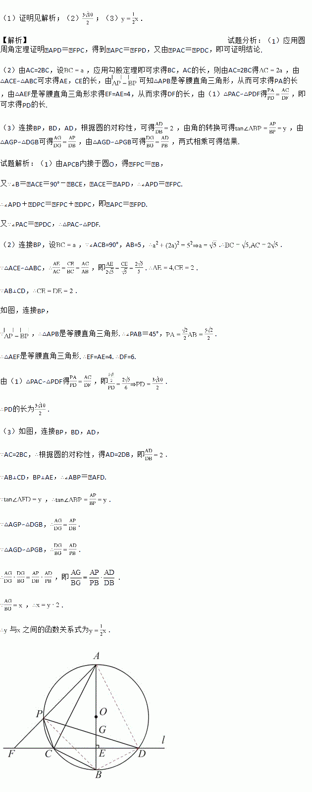 上异于A,C的一个动点,射线AP交l于点F,连接PC与PD,PD交AB于点G.