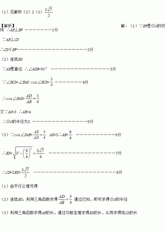 (1)见解析(2)2(3) 【解析】【解析】 (1)∵BF是⊙O的切线 ∴AB⊥BF …………………1分 ∵AB⊥CD ∴CD∥BF………………………………………………2分 (2)连结BD ∵AB是直径 ∴∠ADB=90° ………………………………………3分 ∵∠BCD=∠BAD cos∠BCD=…………………4分 ∴cos∠BAD= 又∵AD=3...