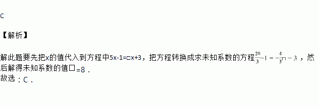 某同学解方程5x-1=□x+3时,把□处数字看错得x=,他把□处看成了( )
