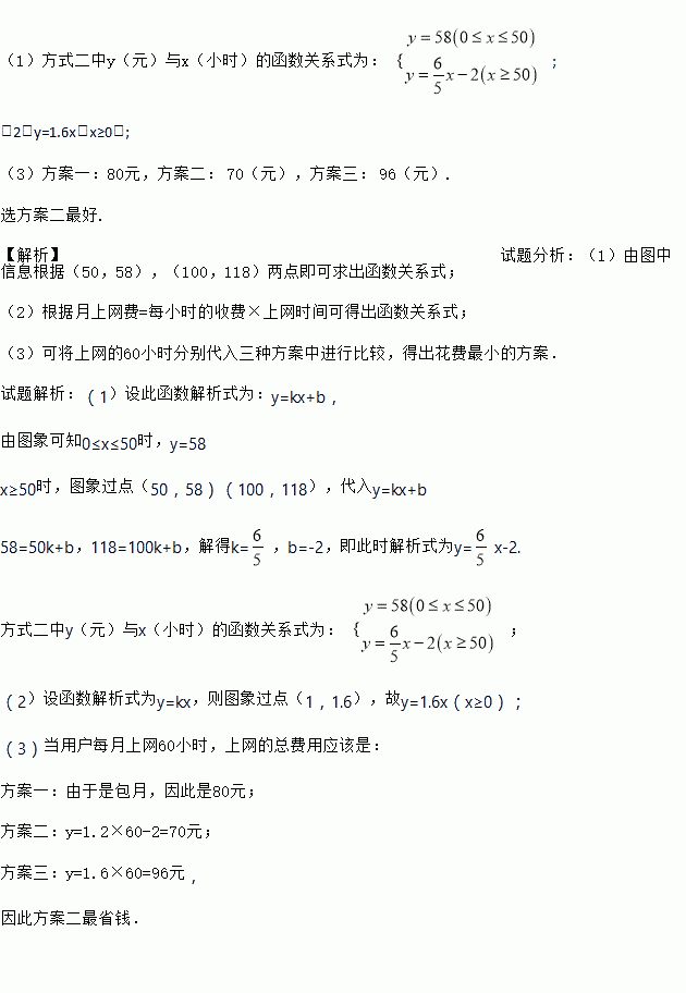 某广电局与长江证券公司联合推出广电宽带网业务,用户通过宽带网可以享受新闻点播、影视欣赏、股市大户室等项服务,用户缴纳上网费的方式有:方式一:每月80元包月;方式二:每月上网费y(元)与上网时间x(小时)的函数关系用如图所示的折线表示;方式三:以0小时为起点,每小时收费1.6元,月收费不超过120元.若设一用户每月上网x小时,月上网费为y元.