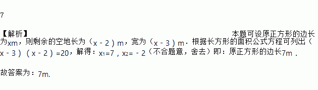 如图,将一块正方形空地划出部分区域进行绿化,原空地一边减少了2m,另一边减少了3m,剩余一块面积为20m2的矩形空地,则原正方形空地的边长为_____m.