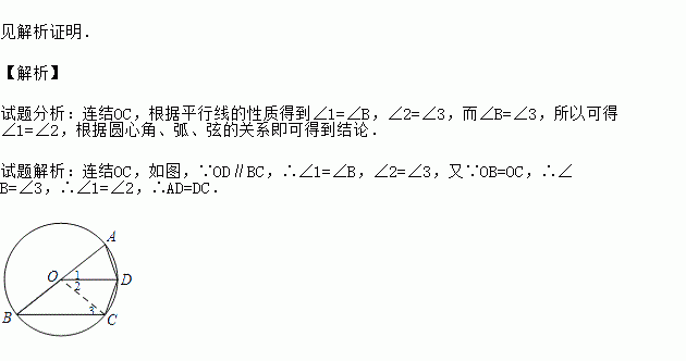 已知:如图,C,D是以AB为直径的⊙O上的两点,且OD∥BC.求证:AD=DC。