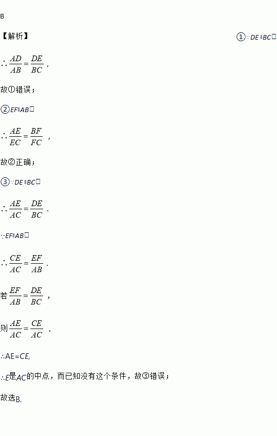 B 【解析】①∵DE ∥BC, ∴, 故①错误; ②EF∥AB, ∴ , 故②正确; ③∵DE ∥BC, ∴. ∵EF∥AB, ∴. 若, 则 , ∴AE=CE, ∴E是AC的中点,而已知没有这个条件,故③错误; 故选B.