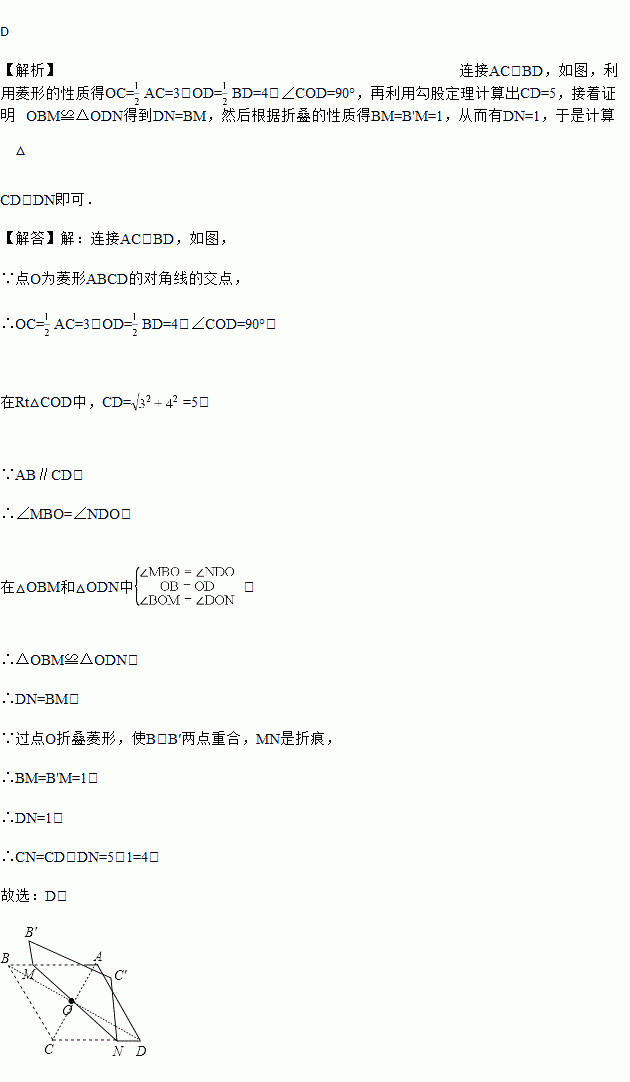对角线长分别为6和8的菱形ABCD如图所示,点O为对角线的交点,过点O折叠菱形,使B,B′两点重合,MN是折痕.若B'M=1,则CN的长为( )