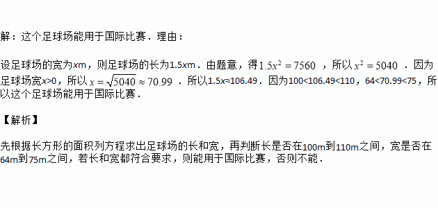 国际比赛的足球场长在100m到110m之间,宽在64m到75m之间,为了迎接2015年的亚洲杯,某地建设了一个长方形的足球场,其长是宽的1.5倍,面积是7560m2.请你判断这个足球场能用于国际比赛吗?并说明理由.