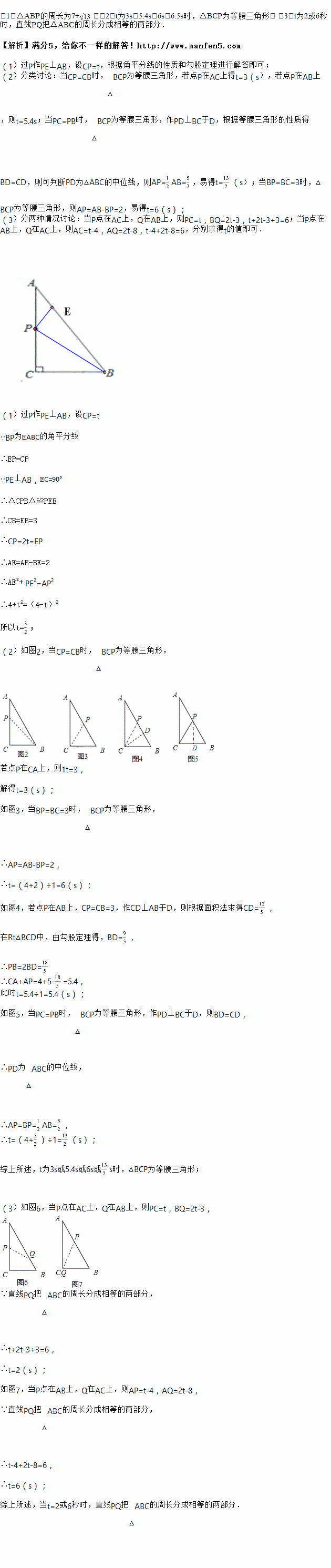 (3)另有一点Q,从点C开始,按C→B→A→C的路径运动,且速度为每秒2cm,若P、Q两点同时出发,当P、Q中有一点到达终点时,另一点也停止运动.当t为何值时,直线PQ把△ABC的周长分成相等的两部分?