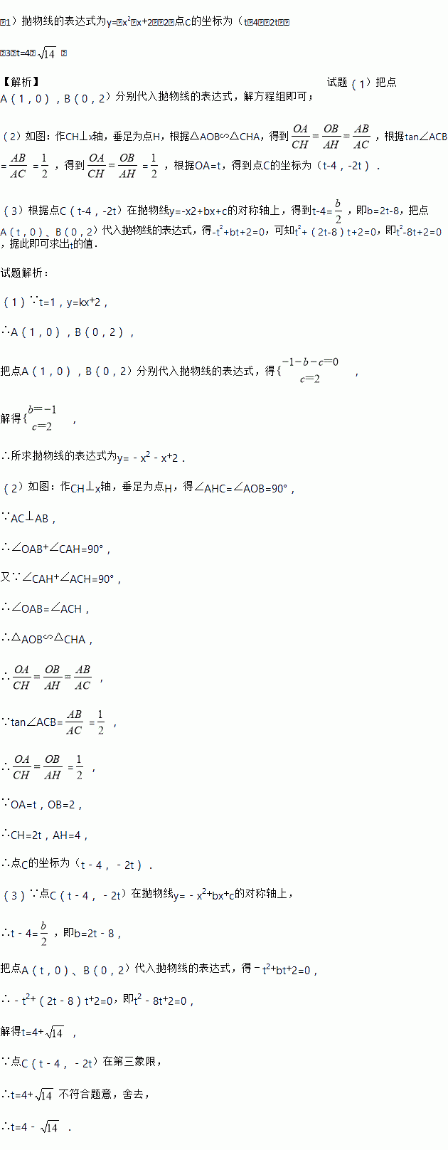 已知:如图,直线y=kx+2与x轴正半轴相交于A(t,0),与y轴相交于点B,抛物线y=﹣x2+bx+c经过点A和点B,点C在第三象象限内,且AC⊥AB,tan∠ACB=