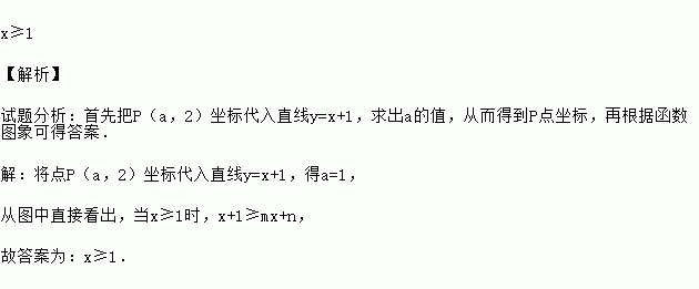 直线l1:y=x+1与直线l2:y=mx+n相交于点P(a,2),则关于x的不等式x+1≥mx+n的解集为 .