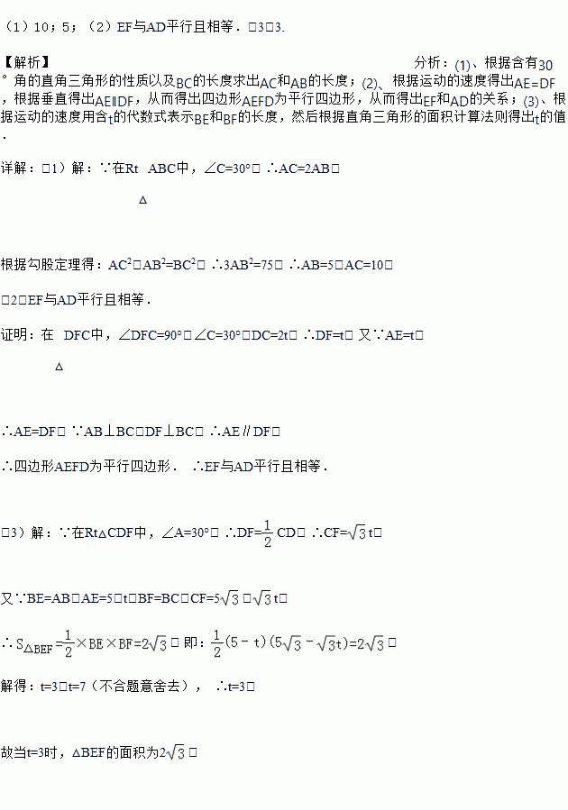 ,∠C=30°.点D从点C出发沿CA方向以每秒2个单位长的速度向A点匀速运动,同时点E从点A出发沿AB方向以每秒1个单位长的速度向点B匀速运动,当其中一个点到达终点时,另一个点也随之停止运动.设点D、E运动的时间是t秒(t>0).过点D作DF⊥BC于点F,连接DE、EF.
