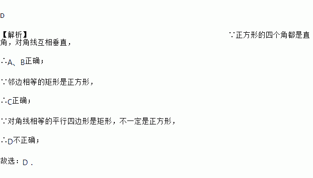 C. 邻边相等的矩形是正方形 D. 对角线相等的平行四边形是正方形