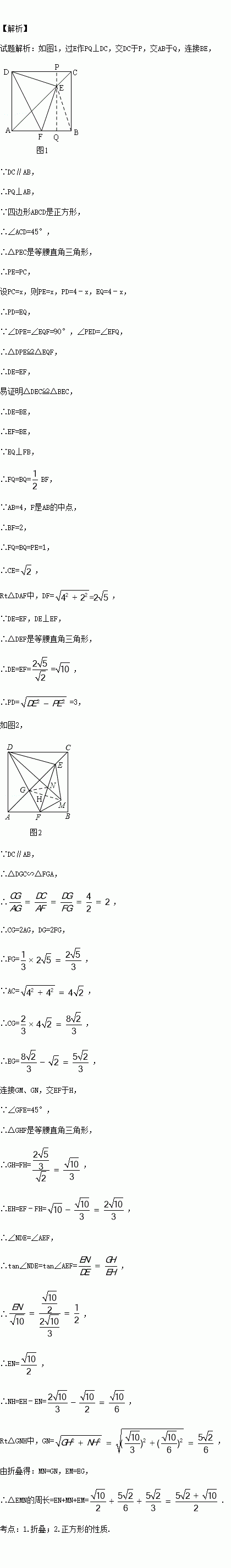 如图,正方形ABCD中,AD=4,点E是对角线AC上一点,连接DE,过点E作EF⊥ED,交AB于点F,连接DF,交AC于点G,将△EFG沿EF翻折,得到△EFM,连接DM,交EF于点N,若点F是AB的中点,则△EMN的周长是 .