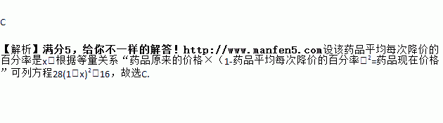 某药品原价每盒28元,为响应国家解决老百姓看病贵的号召,经过连续两次降价,现在售价每盒16元,设该药品平均每次降价的百分率是x,由题意,所列方程正确的是( )